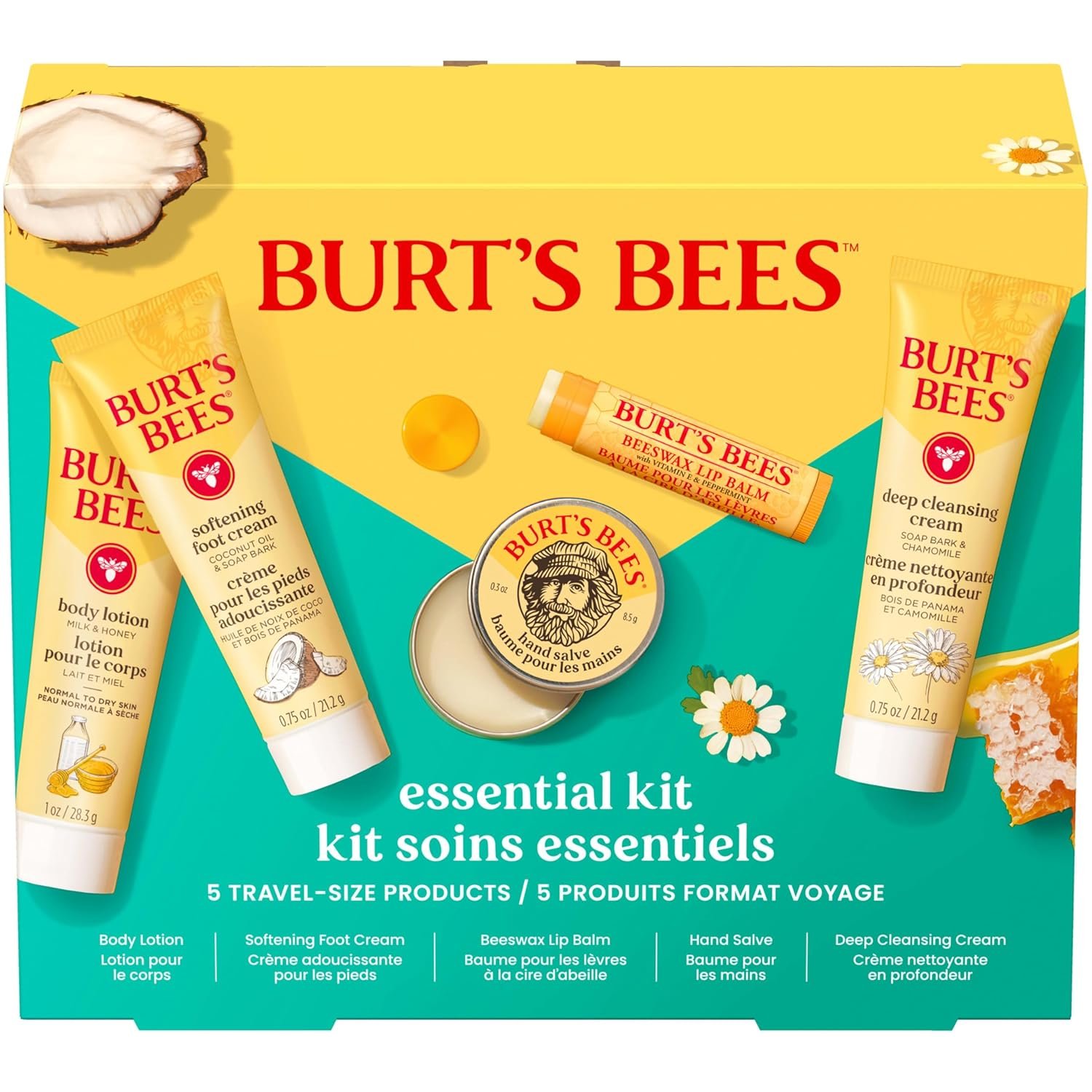 Burt’s Bees Christmas Gifts – Essentials Everyday Set, 5 Travel Size Products for Stocking Stuffers – Deep Cleansing Cream, Hand Salve, Body Lotion, Foot Cream and Original Lip Balm